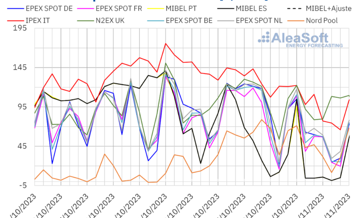 En la primera semana de noviembre, la producción eólica en Italia alcanzó un récord semanal y en Portugal fue la segunda más alta de la historia. Además, casi todos los mercados registraron un aumento en la producción con esta tecnología. Esto, junto con una menor demanda y precios del gas más bajos, contribuyó a una tendencia a la baja en los precios de los mercados eléctricos europeos. Desde el 26 de octubre hasta el 6 de noviembre, el mercado MIBEL tuvo los precios más bajos, excepto el día 31