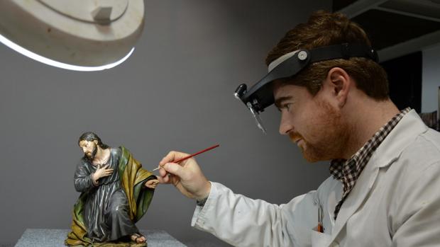 Carlos Peñuela no ha cumplido aún 30 años y por sus manos han pasado ya algunos de los iconos religiosos y hermandades señeras de Sevilla para su restauración.