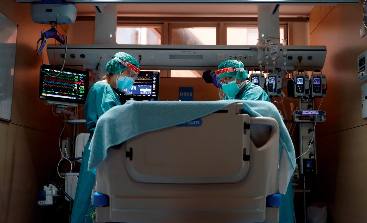 Dos profesionales sanitarios trabajan en la UCI del Hospital Vall d'Hebron de Barcelona. EFE/Alberto Estévez/Archivo
