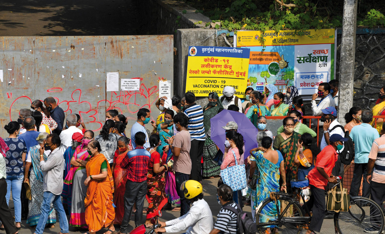 People gather outside an entrance gate of a Covid-19 coronavirus vaccination centre in Mumbai on April 28, 2021. (Photo by INDRANIL MUKHERJEE / AFP) (Photo by INDRANIL MUKHERJEE/AFP via Getty Images)