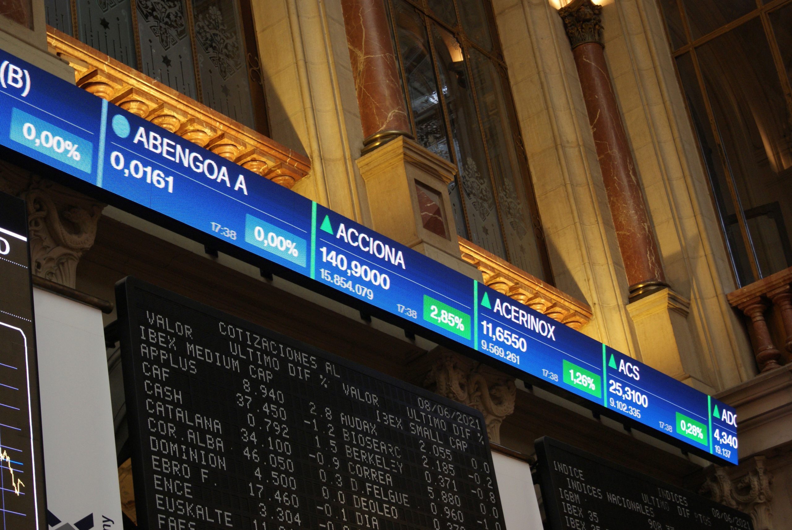 GRAF5915. MADRID, 08/06/2021.- Unas pantallas muestran información sobre empresas este martes en la Bolsa de Madrid. El principal índice de la Bolsa española, el Ibex35, bajó este martes un 0,11 %, lastrado por el sector bancario y por valores relacionados con el turismo, y se aleja del nivel de los 9.200 puntos. Con los inversores pendientes de la reunión del consejo de gobierno del Banco Central Europeo (BCE) del próximo jueves y de los datos de inflación en EE.UU., que se conocerán ese mismo día, el selectivo español se dejó 10 puntos y cerró en 9.153,6 EFE/ Esther Egea