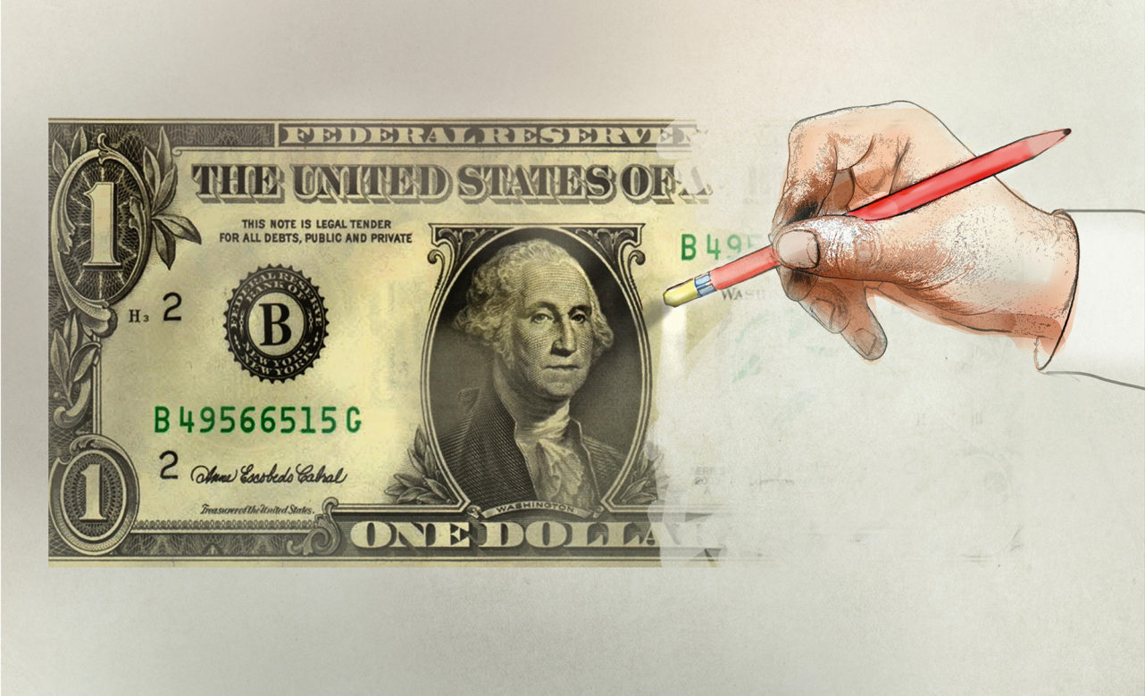 Conceptual illustration of a hand rubbing out a dollar bill depicting loss of money.