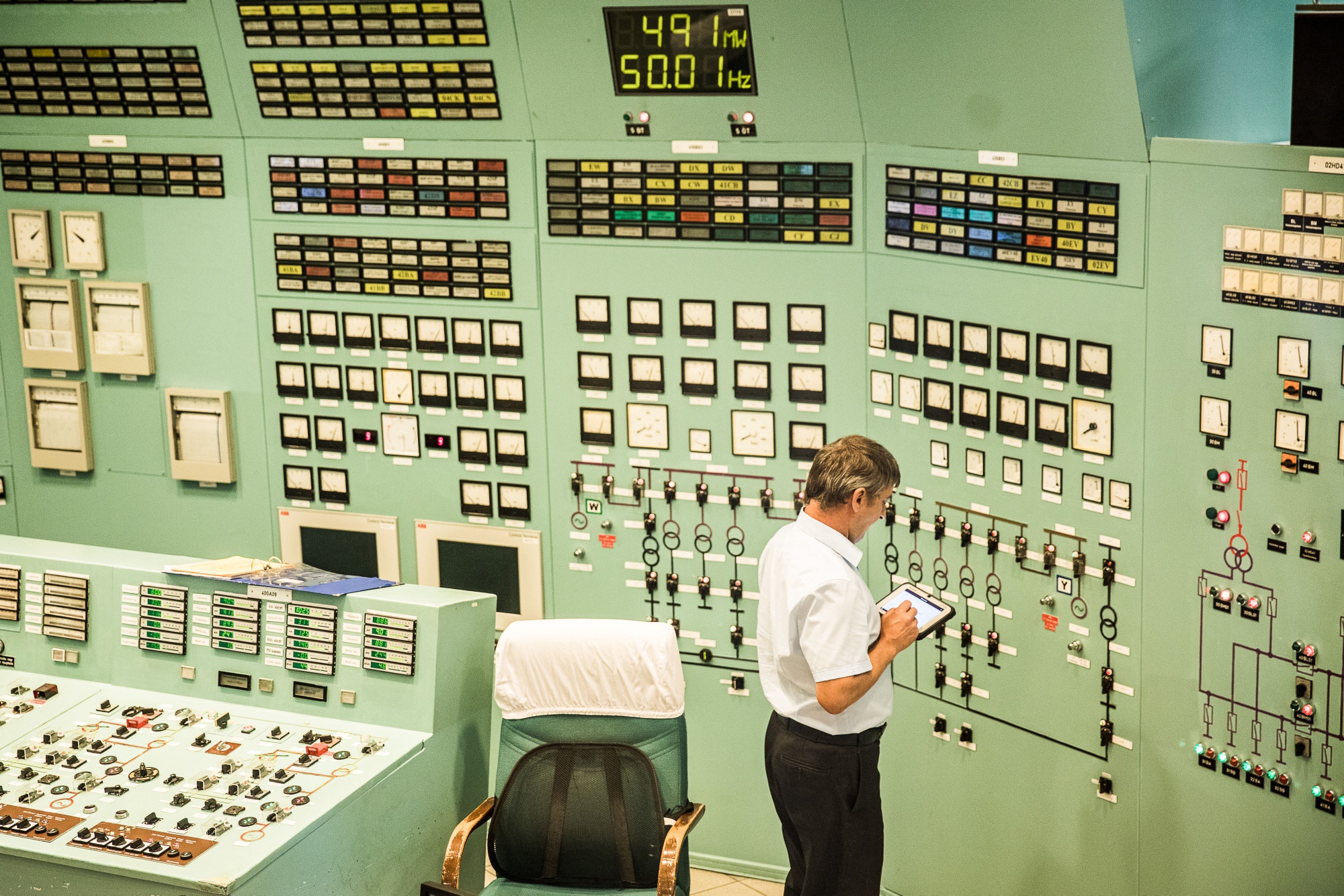Un empleado sostiene una tableta en la sala de control de la central nuclear de Paks en Hungría.