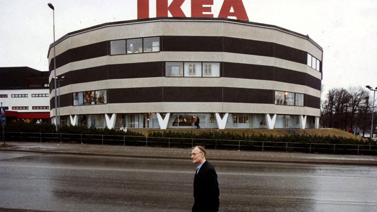 El fundador de la cadena de muebles IKEA, Ingvar Kamprad, frente a la primera tienda en Estocolmo en 1989.