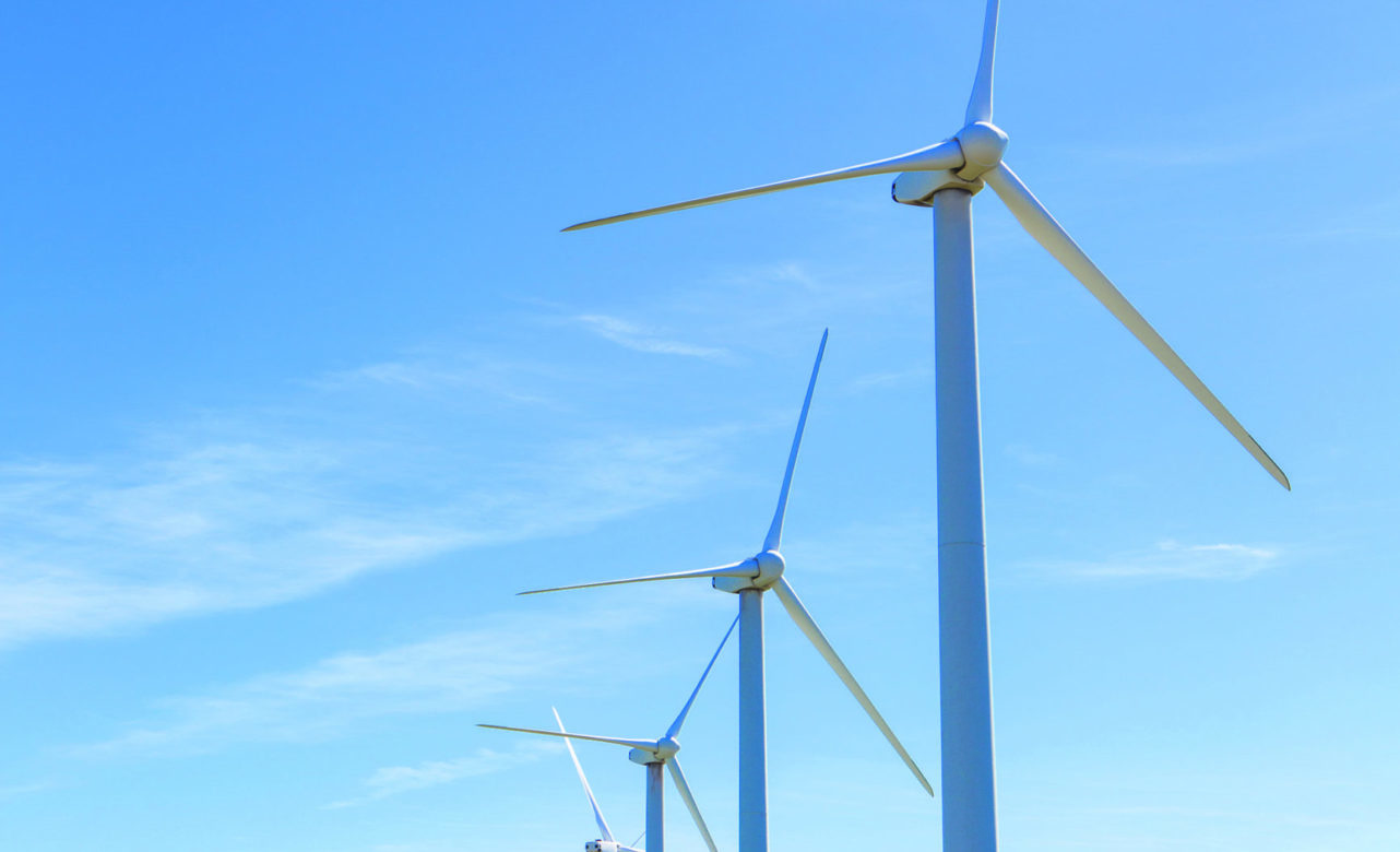 A row of wind turbines stand tall against a bright blue sky creating renewable energy.