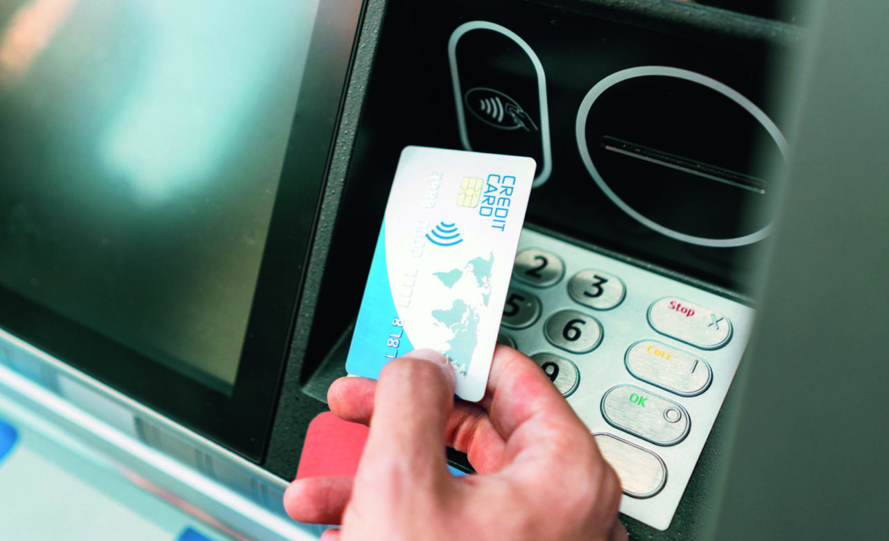 Close-up image of man’s hand inserting bank cart in the ATM slot