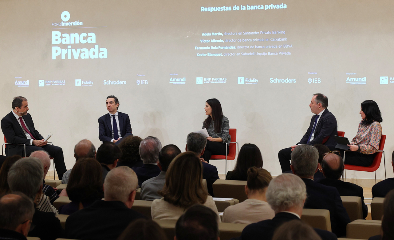 Los cuatro banqueros privados más importantes de España se reunieron en el Foro Inversión Banca Privada, editado por la revista Inversión con el impulso de Amundi Iberia, BNP Paribas AM, Fidelity International y Schroders, y con la colaboración del IEB. Su debate, que se extendió por más de 45 minutos frente a un centenar de invitados, dejó varias conclusiones. La primera, una autocrítica: la banca privada aún tiene que aprender mucho de la particular.