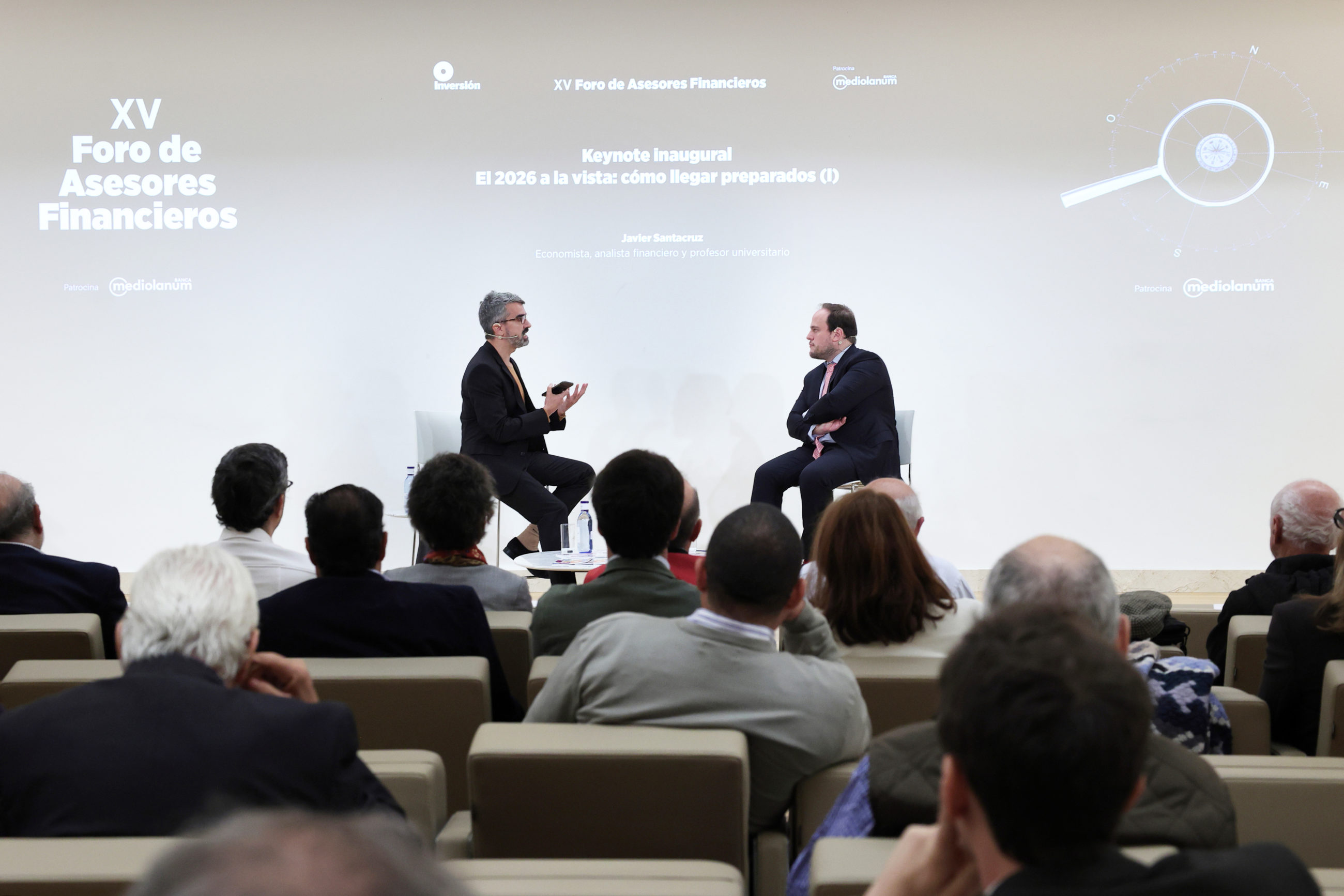 El economista Javier Santacruz subrayó que la clave para los asesores está en situar correctamente el punto del ciclo y anticipar las decisiones de inversión. En la imagen, junto a Ismael García Villarejo.