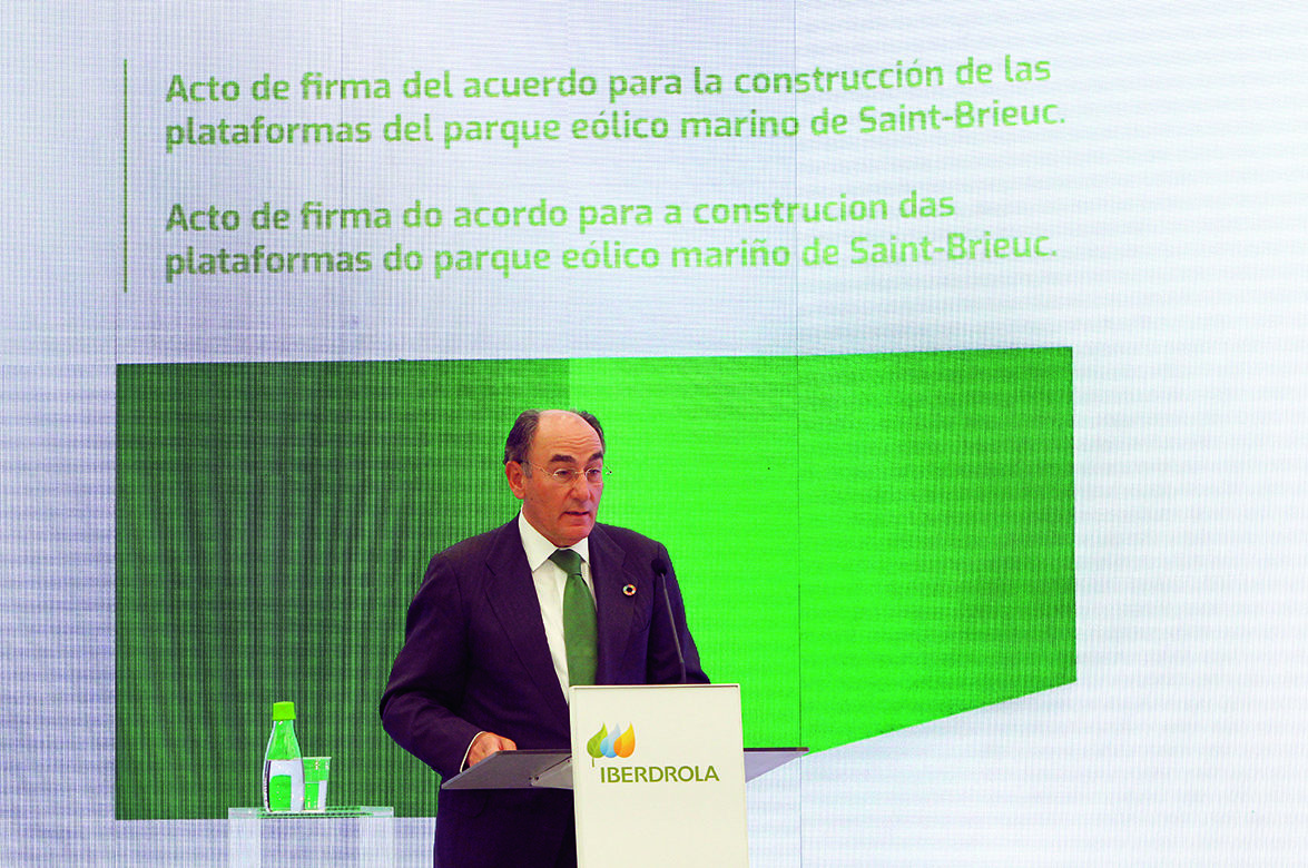 El presidente de Iberdrola, Ignacio Galán, ofrece un discurso durante la firma de un acuerdo con Navantia en Fene, A Coruña, ante el presidente de la Xunta, Alberto Núñez Feijoo (c), para la fabricación de 62 estructuras para un parque eólico en Francia. EFE/Kiko Delgado