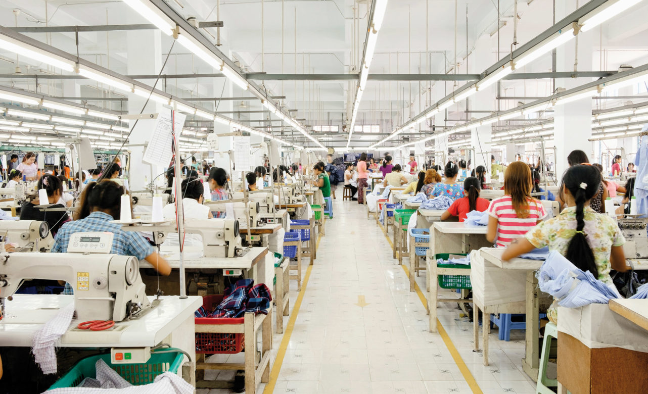 Asian worker sewing clothing in garment factory