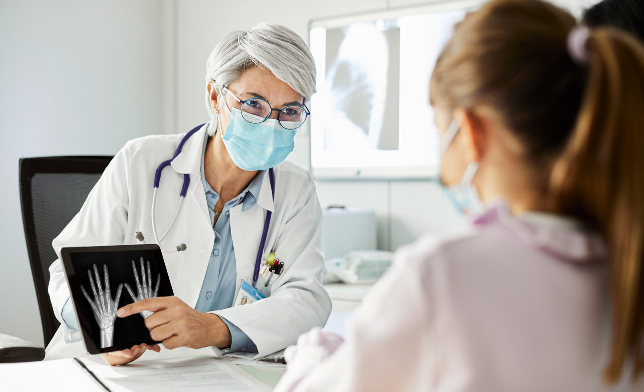 Mature female doctor showing x-ray of hands to patient. Healthcare worker is explaining girl over digital tablet. They are in clinic during COVID-19 crisis.