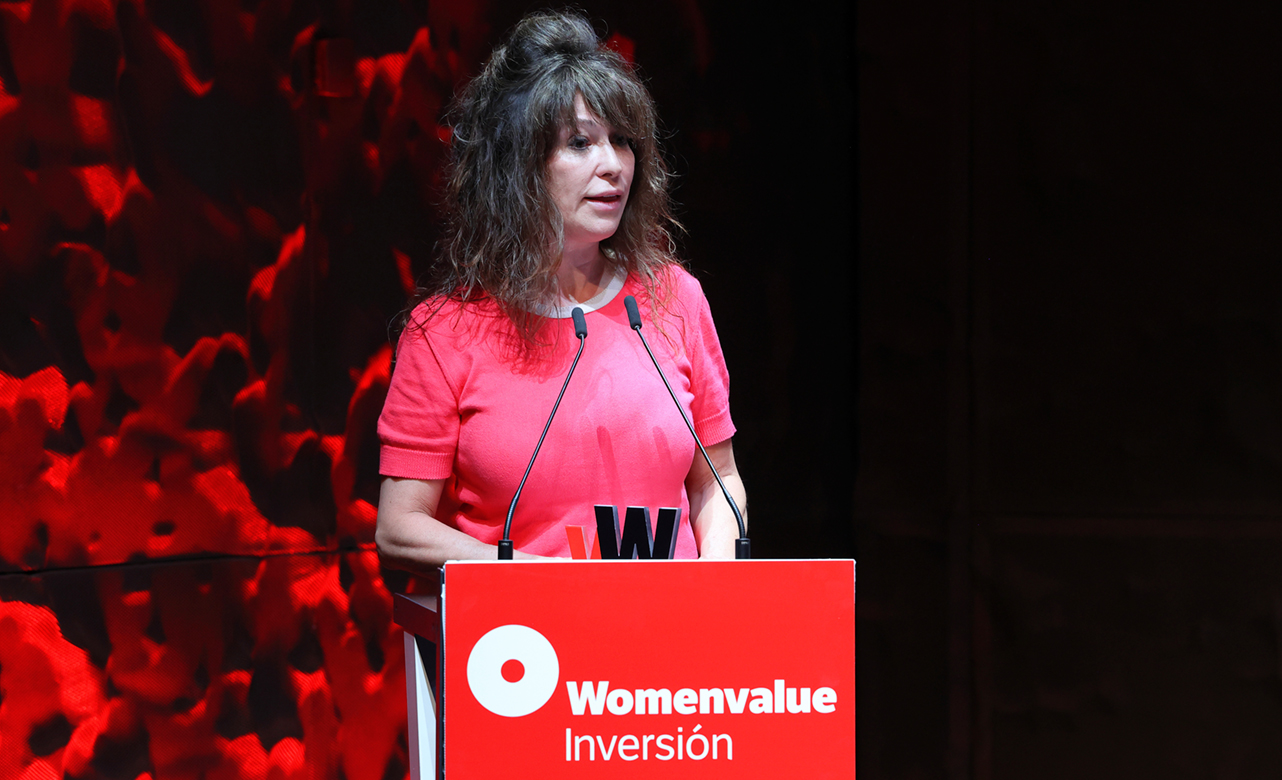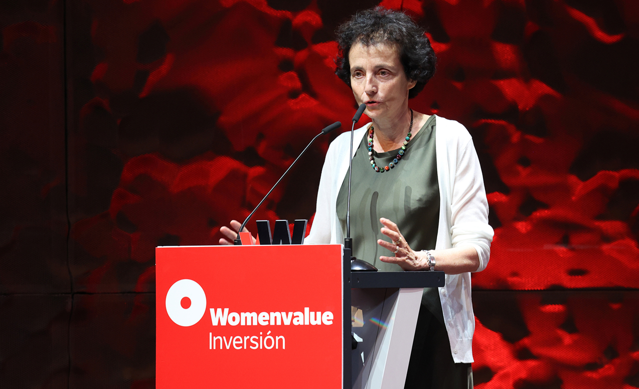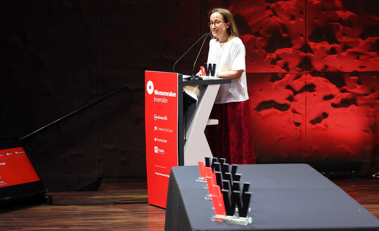 María Ángeles León, fundadora de Global Social Impact, durante su discurso de agradecimiento al recibir el Premio Womenvalue 2025 en la categoría de Finanzas Responsables.
