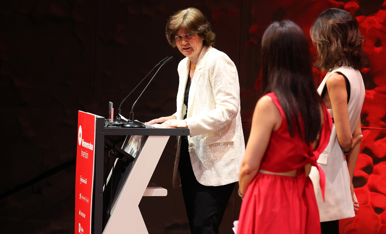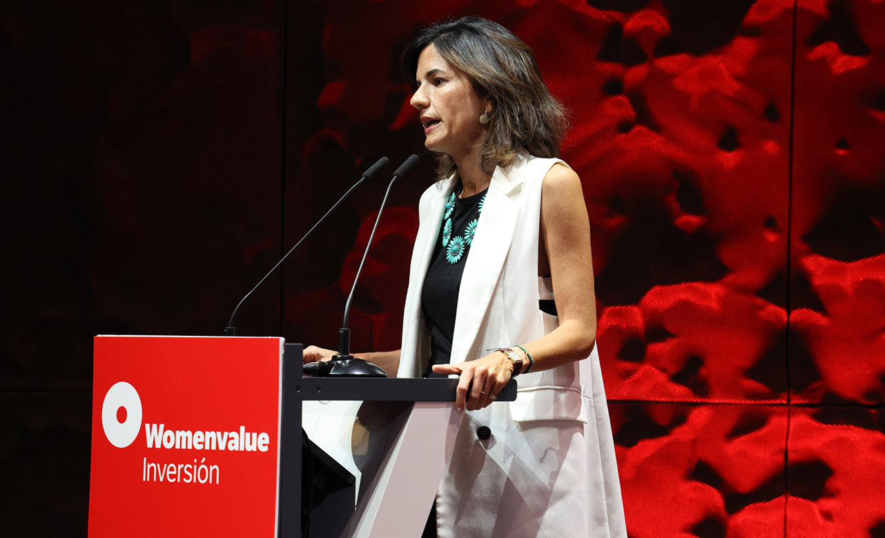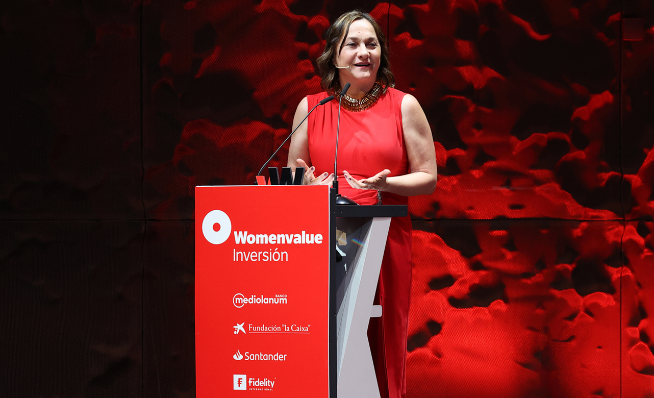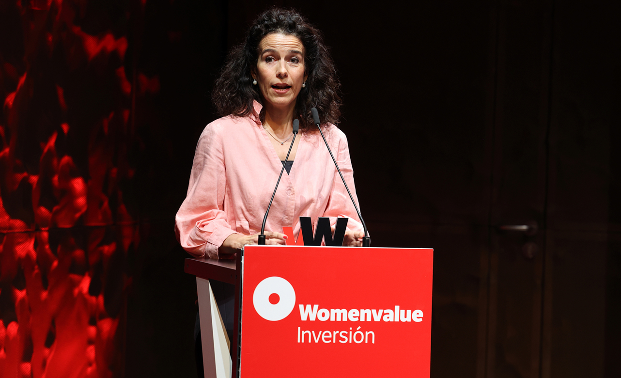 María Ángeles León, fundadora de Global Social Impact, durante su discurso de agradecimiento al recibir el Premio Womenvalue 2025 en la categoría de Finanzas Responsables.