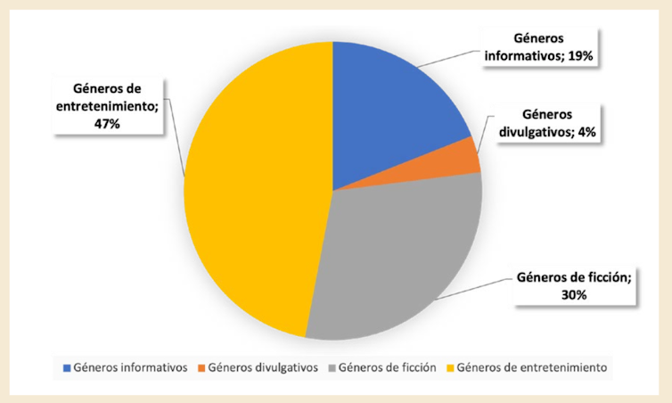Desde una perspectiva global, los géneros televisivos más consumidos en TikTok son el entretenimiento (47 por ciento), los fragmentos de ficción (30) y los contenidos informativos (19).