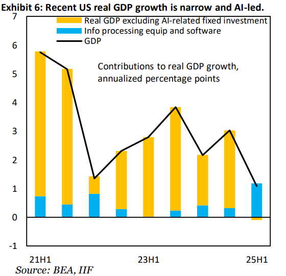 Una de las señales más contundentes llega desde Estados Unidos. El gráfico del IIF sobre el PIB real estadounidense muestra cómo el crecimiento reciente se ha vuelto “estrecho" y correlacionado con la IA: buena parte del dinamismo económico procede de la inversión en software, equipamiento informático y activos relacionados directamente con el despliegue de modelos avanzados de entrenamiento y procesamiento de datos.