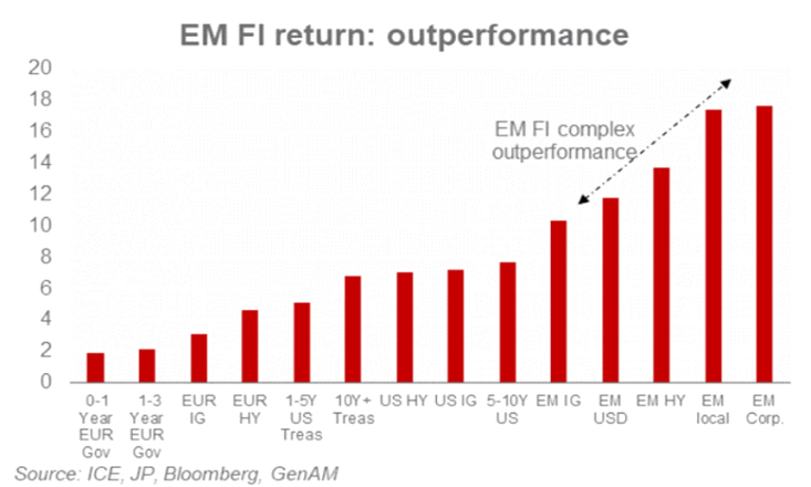 La renta fija de los mercados emergentes ha sido la clase de activos de renta fija con mejor rentabilidad en lo que va de año, con una importante compresión del diferencial de 50 puntos básicos para la deuda externa y una caída de 50 puntos básicos en el rendimiento global de la deuda local, asegura Guillaume Tresca, estratega sénior de mercados emergentes, en Generali AM, del grupo Generali Investments.