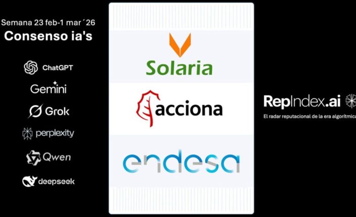 Hemeroteca Solaria, Acciona y Endesa muestran fortaleza reputacional algorítmica IBEX35 en consenso IAs de Repindex.AI Economía Digital 3 Mar 2026 Solaria, Acciona y Endesa lideran la reputación del IBEX35 según el consenso de seis modelos de inteligencia artificial